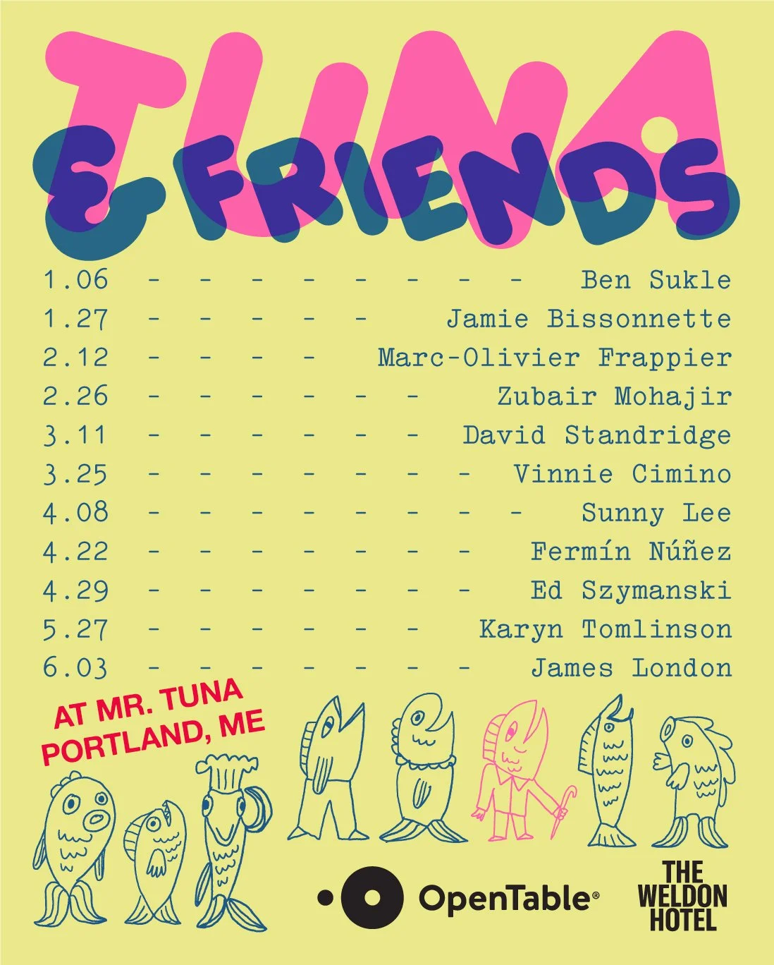 Tuna & Friends is a guest chef pop-up dinner series celebrating sustainable seafood. Running from January to June, we’re bringing in award-winning chefs from across North America to create an a la carte menu inspired by New England’s natural bounty, with additional dishes shaped by their own influences and sourcing. Along the way, they’ll take a journey through Portland's working waterfront, exploring where our seafood originates and how it’s handled, including visits to Bangs Island Mussels and Upstream Seafood to the Gulf of Maine Research Institute, and other community treasures. Dinners will take place from 5pm to 9pm. Reservations encouraged, walk-ins welcome.
